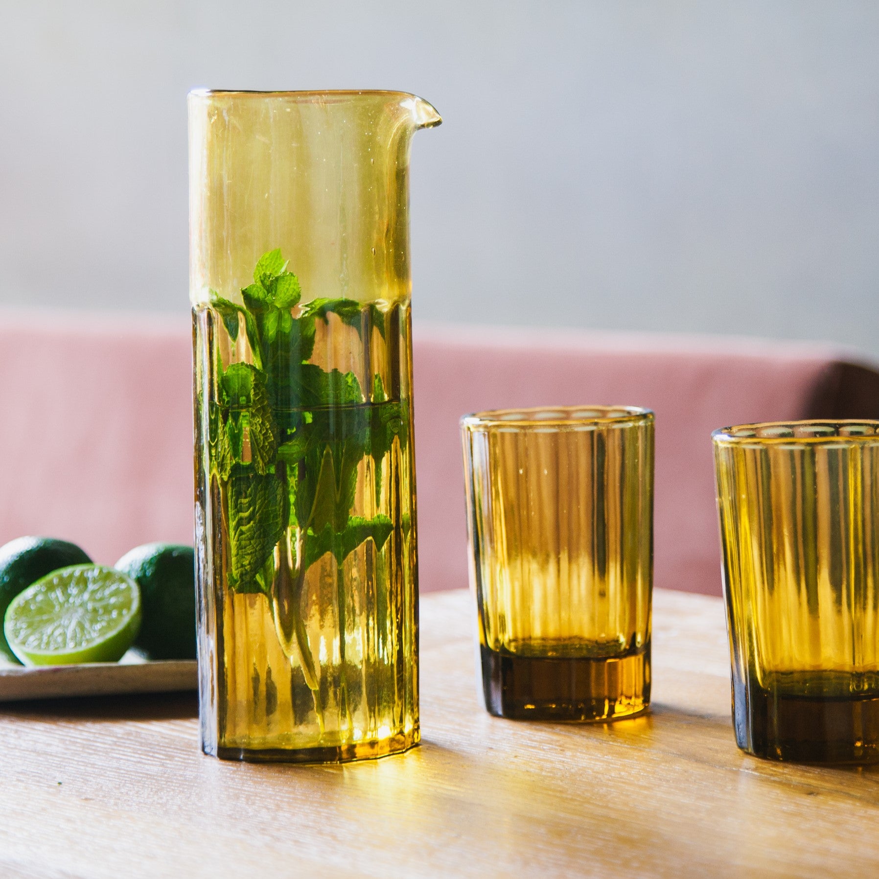 Heavy, mouth blown Art Deco inspired carafe. Hand made from recycled glass by Indian artisans. Due to this manufacturing process, small inconsistencies may occur. Hand wash recommended.