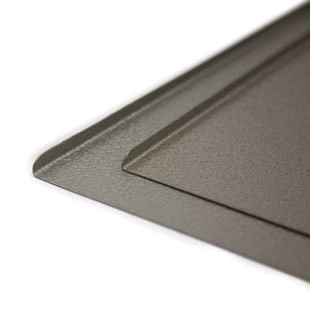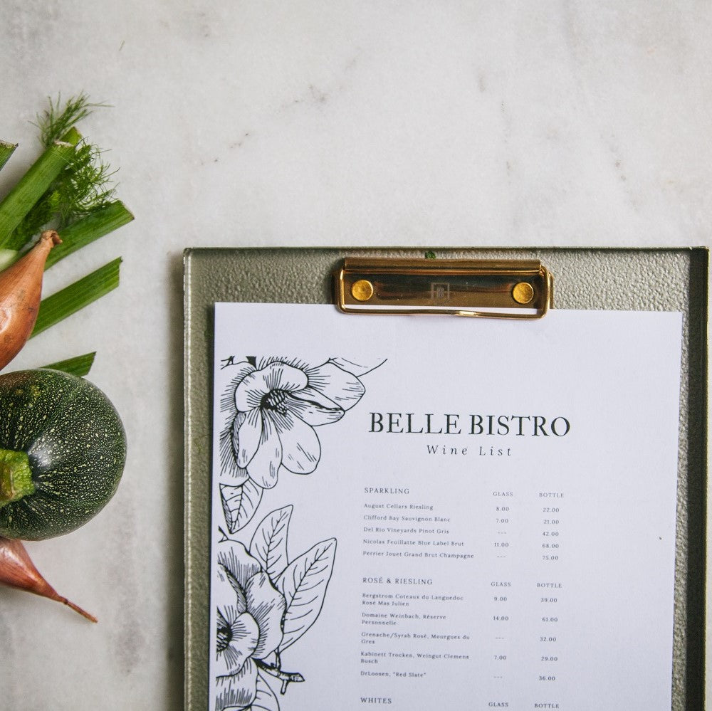 A4 Metal clipboard in hammered green paint and with a flashy brass plated clip. The elevated egdes, smooth surface and heavy weight make these Clipboards perfect for menus in cafe’s and restaurants. Available in A4 and A5.