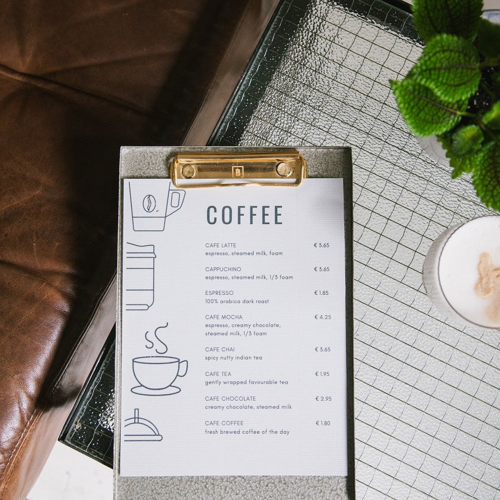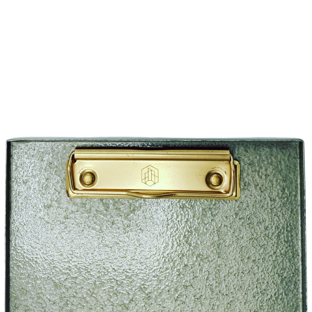 A5 Metal clipboard in hammered green paint and with a flashy brass plated clip. The elevated egdes, smooth surface and heavy weight make these Clipboards perfect for menus in cafe’s and restaurants. Available in A4 and A5.