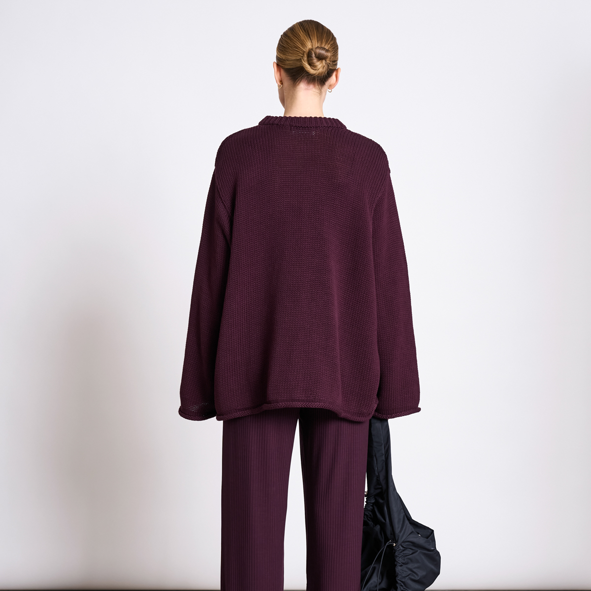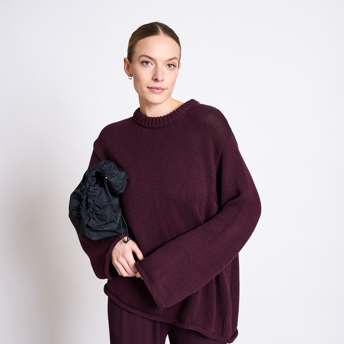 This is SONA, giving us oversized and coziness vibes. It has a tighter, thick neckline and rolled hems. The cut is rather longer and wide and will keep you in comfort whenever needed. The sleeves are also quite wide for an extra cool look.