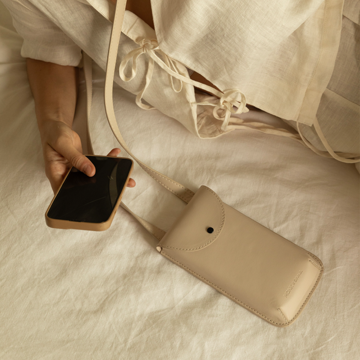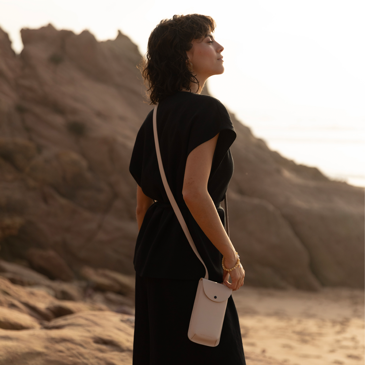 We aim to reduce our footprint in this beautiful world. We made the next step and made this Monk & Anna phone pouch of recycled vegan leather & recycled vegan suede. It’s no longer wrapped in plastic, but protected by a semi-transparent dust bag – which can be used again to store the bag when you’re not wearing it. Enjoy!