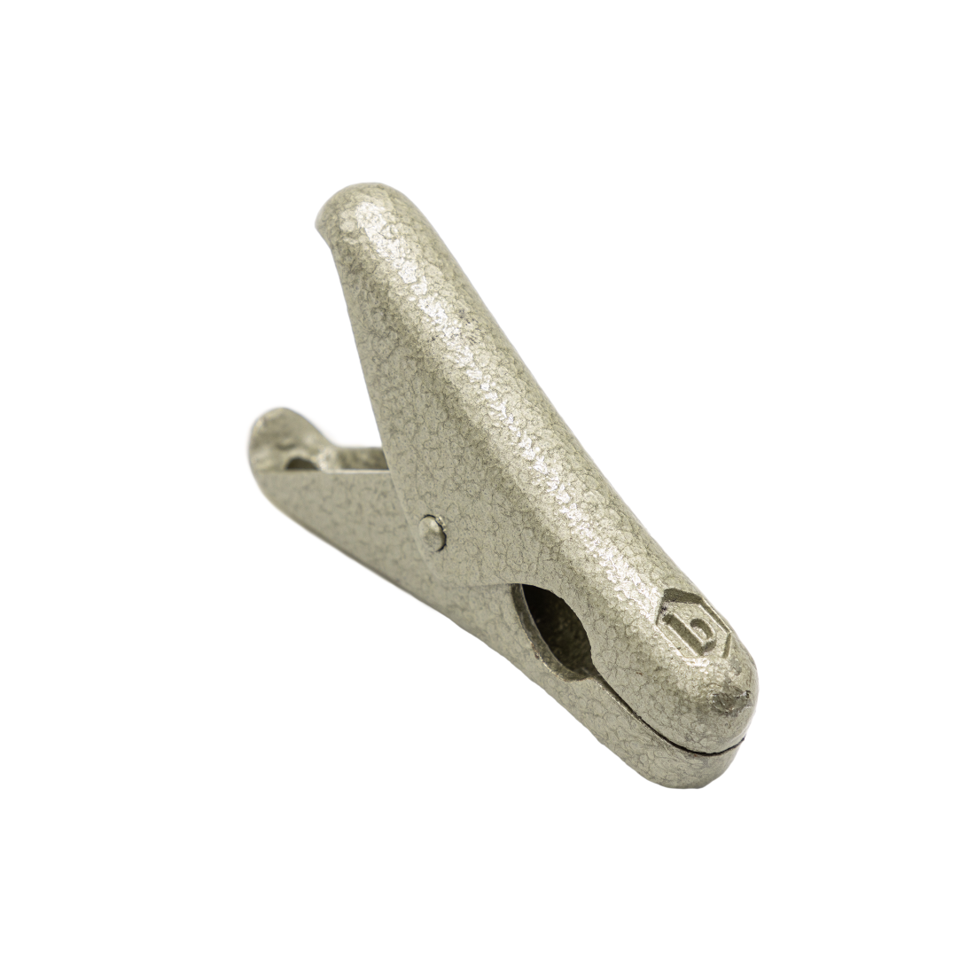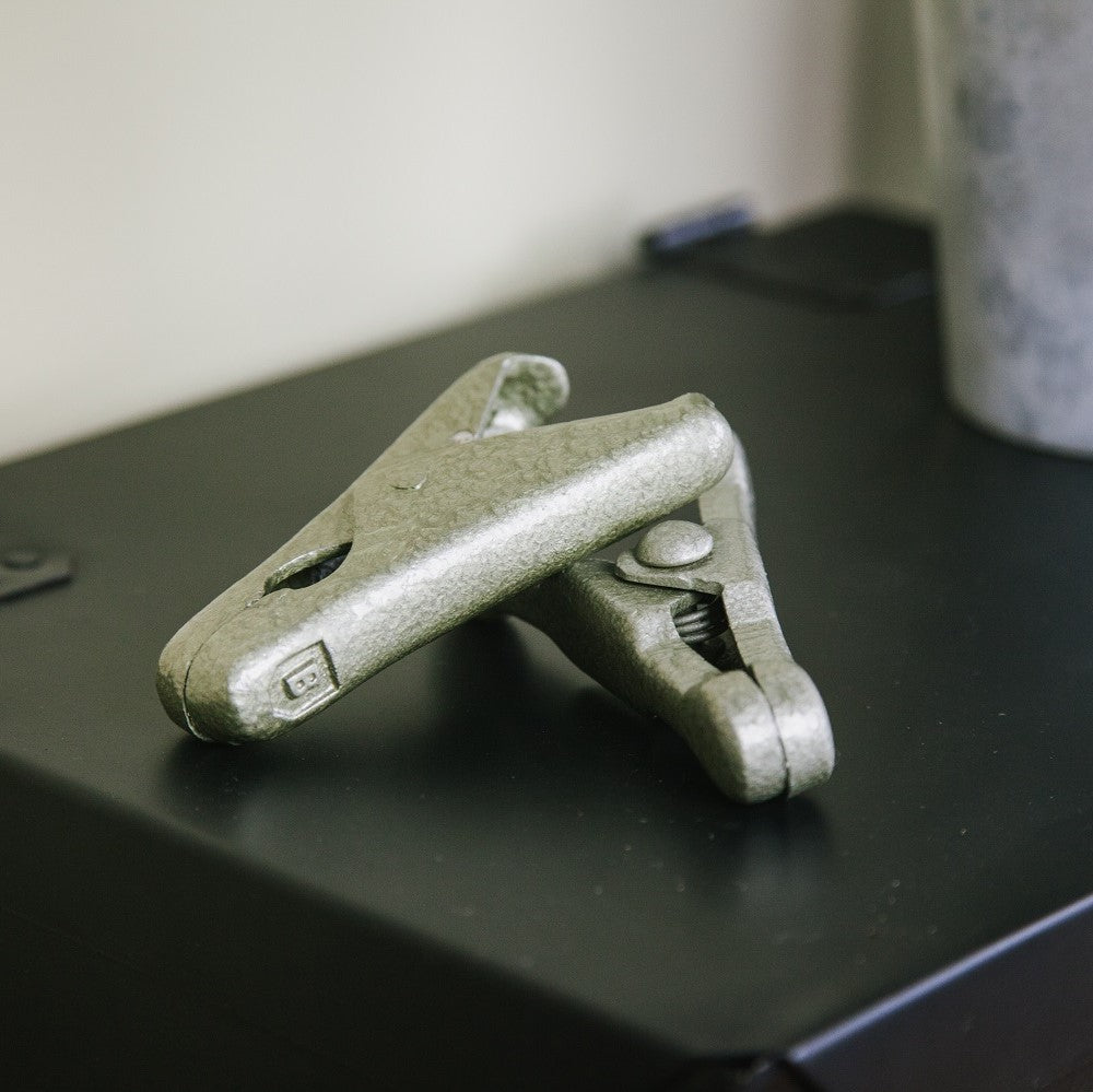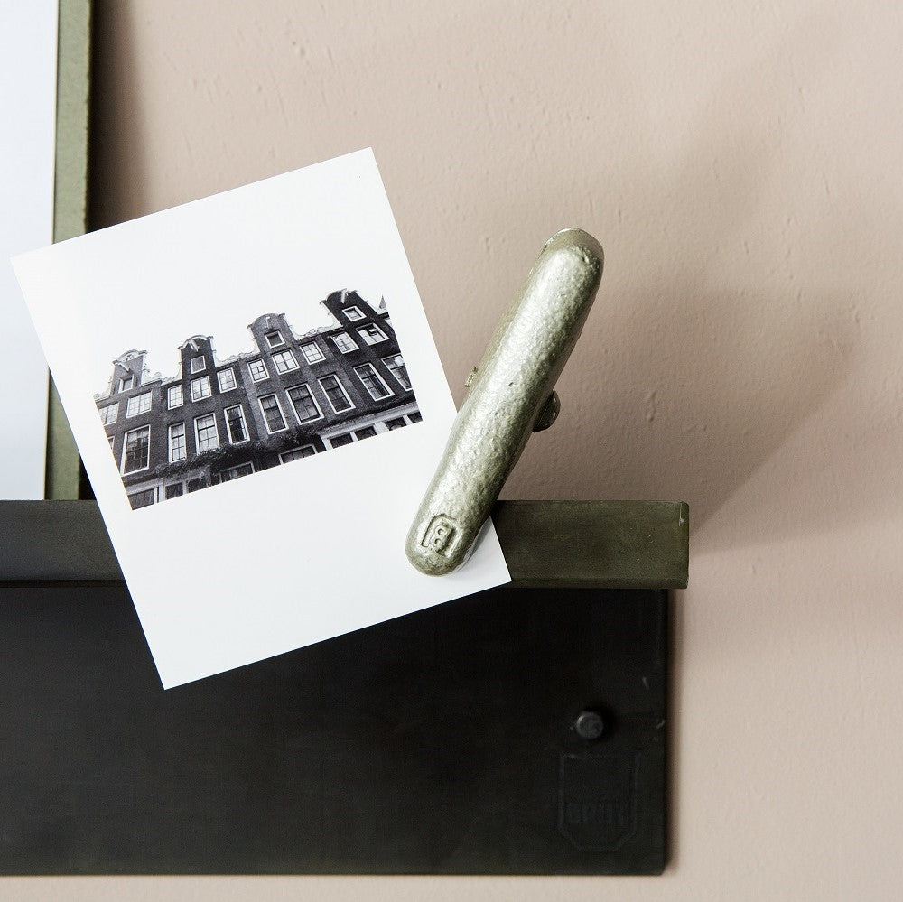 Inspired by an old fashioned car battery clamp, this strong clip will hold your pictures, grocery list or receipts. The hole on top makes it possible to screw it to the wall. The colour is custom hammered paint for Brût Homeware. 10 cm.