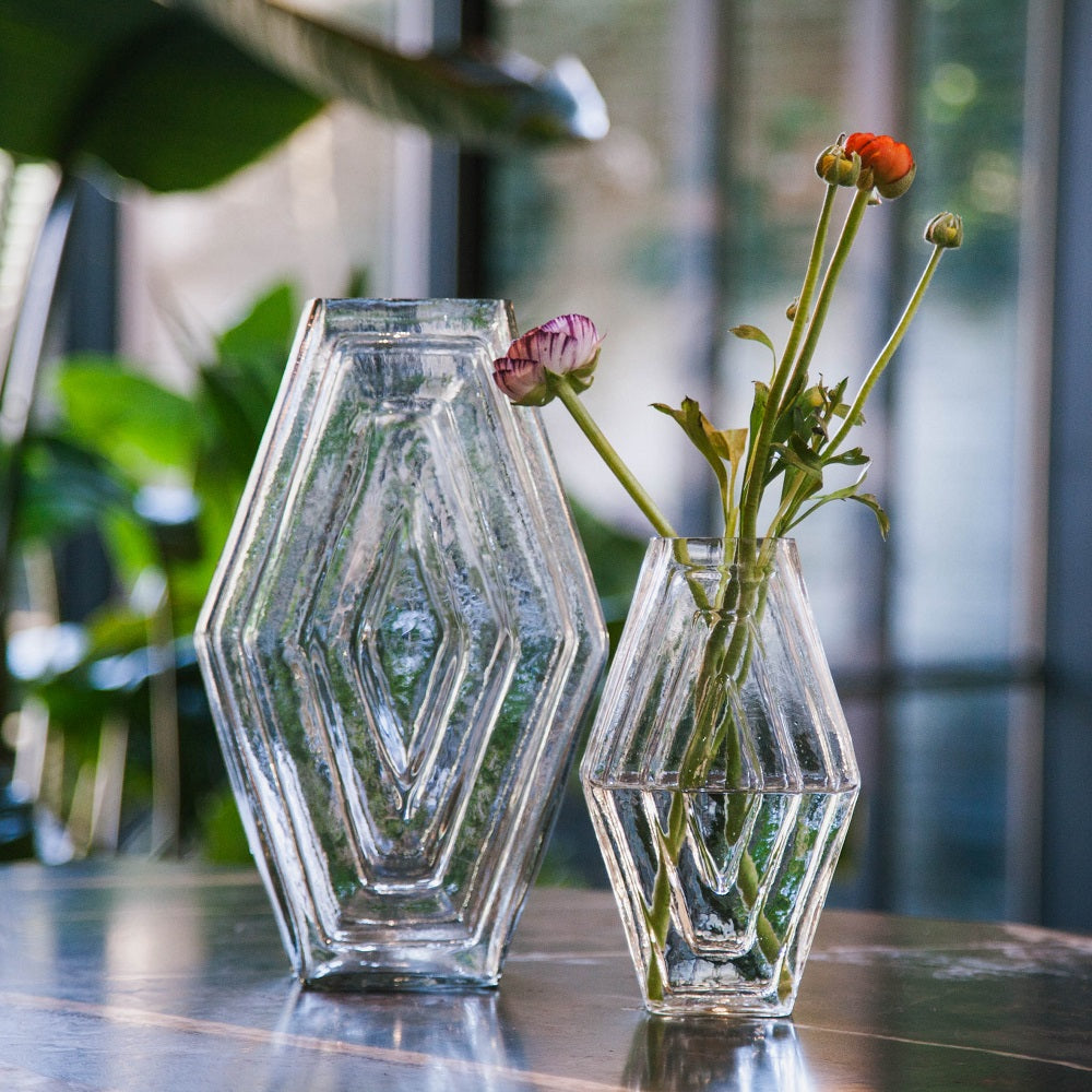 Inspired by 20th century Amsterdam architecture this vase is a show stopper in your home. Hand made from recycled glass by Indian artisans. Due to this manufacturing process, small inconsistencies may occur. Hand wash recommended.