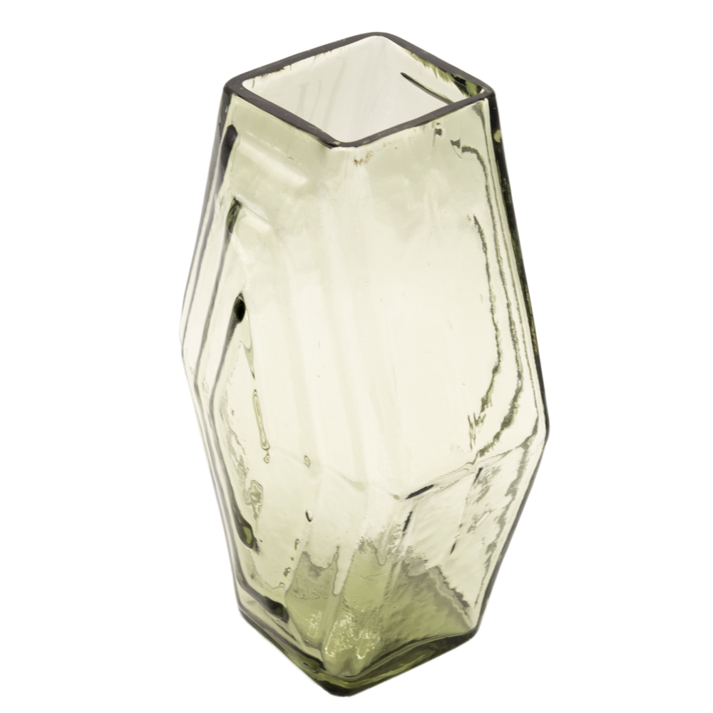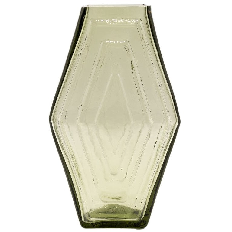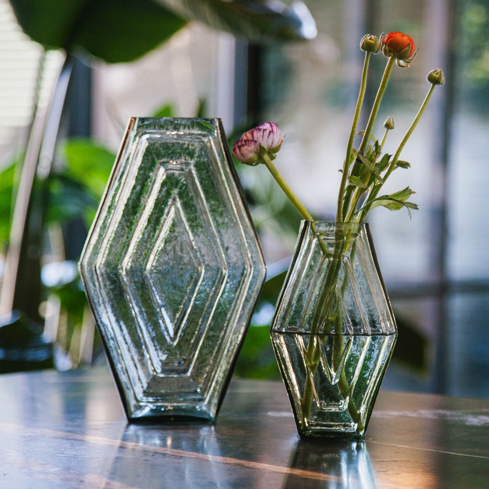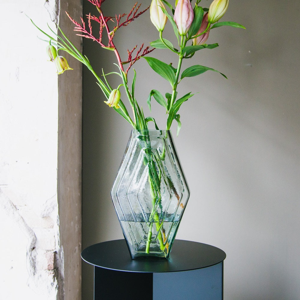 Inspired by 20th century Amsterdam architecture this vase is a show stopper in your home. Hand made from recycled glass by Indian artisans. Due to this manufacturing process, small inconsistencies may occur. Hand wash recommended.